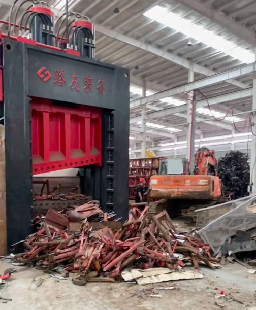 路友廢鋼龍門(mén)剪正在對(duì)建筑工地管架、貨車(chē)車(chē)架及馬路欄桿等結(jié)構(gòu)的剪切作業(yè)