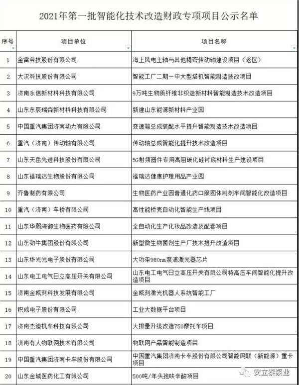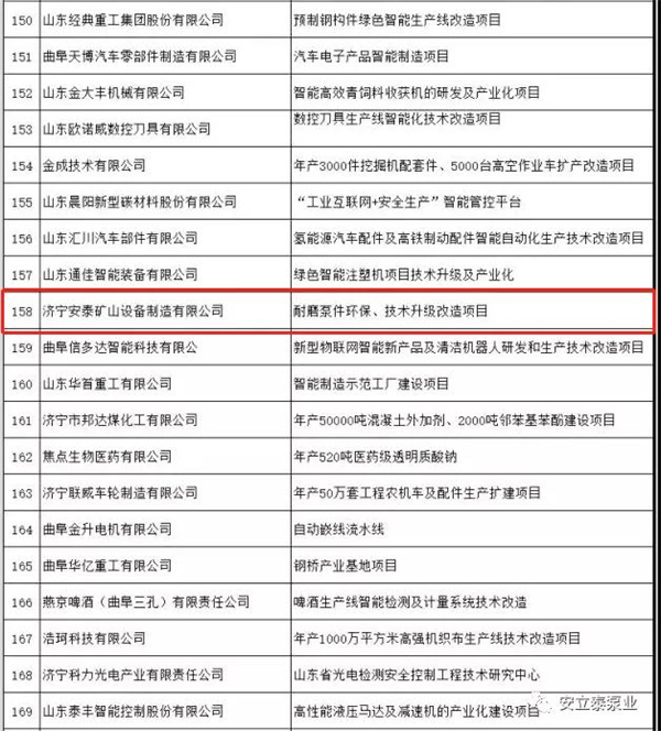 濟(jì)寧安泰礦山設(shè)備制造有限公司(簡稱安泰泵業(yè))經(jīng)企業(yè)申報(bào)、各市推薦、專家評審等環(huán)節(jié),入選列入2021年第一批智能化技術(shù)改造財(cái)政專項(xiàng)項(xiàng)目名單,公示時(shí)間為2021年10月11日-15日(5個(gè)工作日)。